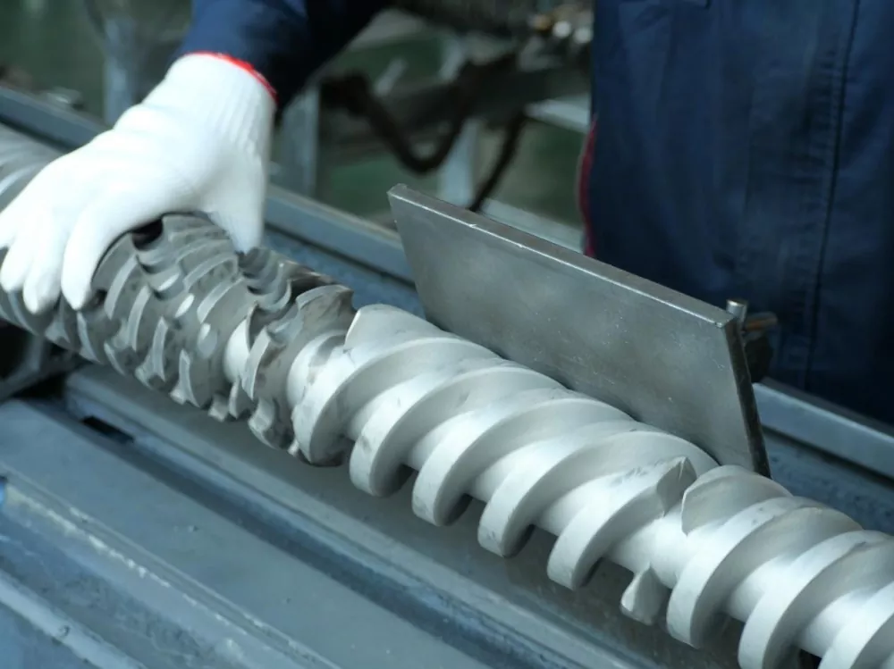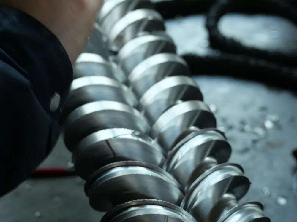 Интихоби мавод низ муҳим аст. Бурдҳои мо аз пӯлоди хӯлаи нитридори 38CrMoALA баландсифат сохта шудаанд. Он аз коркарди ҳафтрӯзаи хомӯшкунӣ ва нитриткунӣ мегузарад, ки дар натиҷа қабати ғафси нитридори 0,50-0,70 мм ва сахтии сатҳи HV950-1050 ба вуҷуд меояд. Ин хосиятҳои моддӣ муқовимати аълои фарсудашавиро ҳатто дар ҳарорати тақрибан 200 ° C таъмин мекунанд ва мӯҳлати хидматрасонии винтро дар муқоиса бо маҳсулоти муқаррарӣ ҳадди аққал панҷ як ҳиссаи дароз мекунанд. Ин ҷилавгирӣ аз ҷамъшавии маводро дар кунҷҳои мурда аз сабаби фарсудашавии сатҳи истифодаи дарозмуддат пешгирӣ мекунад.